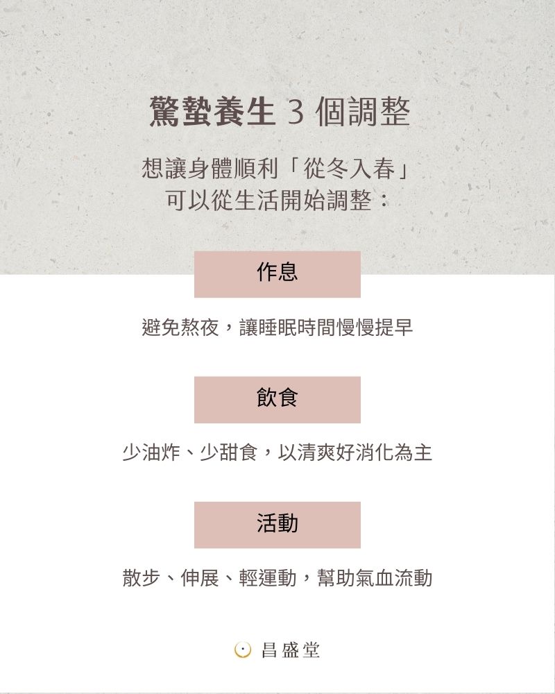 • 作息方面:不必劇烈改變生活節奏,但應盡量避免熬夜,讓作息隨節氣慢慢提早,有助於陽氣自然升發。