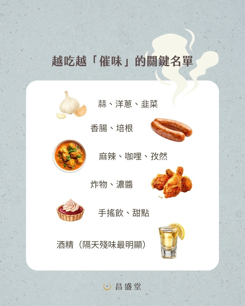 - 蒜臭/硫味:飲食(蒜、洋蔥、辛香)、酒精、抽菸。