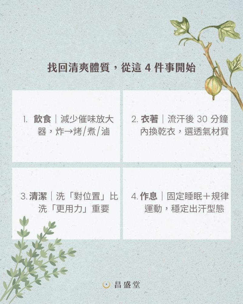 核心原則只有一句:體味多半是「汗+皮脂+細菌分解」被悶住、停留太久而放大。改善要做的是「降悶、降油、穩菌相、穩出汗型態」。