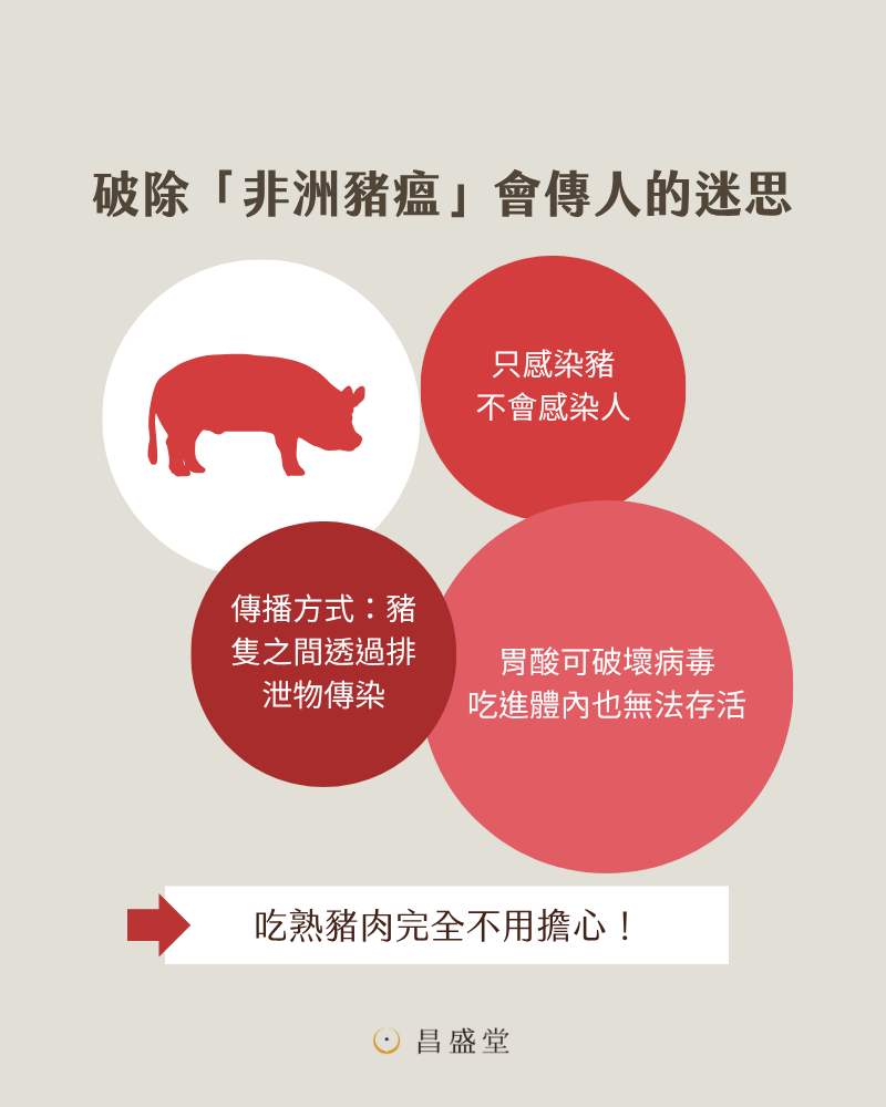 非洲豬瘟病毒只會感染豬,不會感染人。即使誤食受感染的豬肉,人體的胃酸酸度極高(pH值約1.5~3.5),足以在短時間內破壞病毒,使它失去活性,無法在體內生存或繁殖。