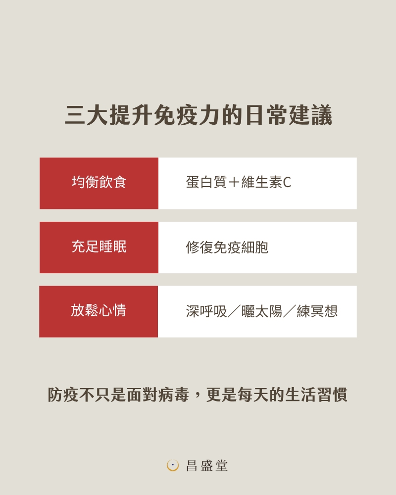 1️⃣ 均衡飲食:攝取足夠的蛋白質與維生素C,讓免疫細胞維持活力。