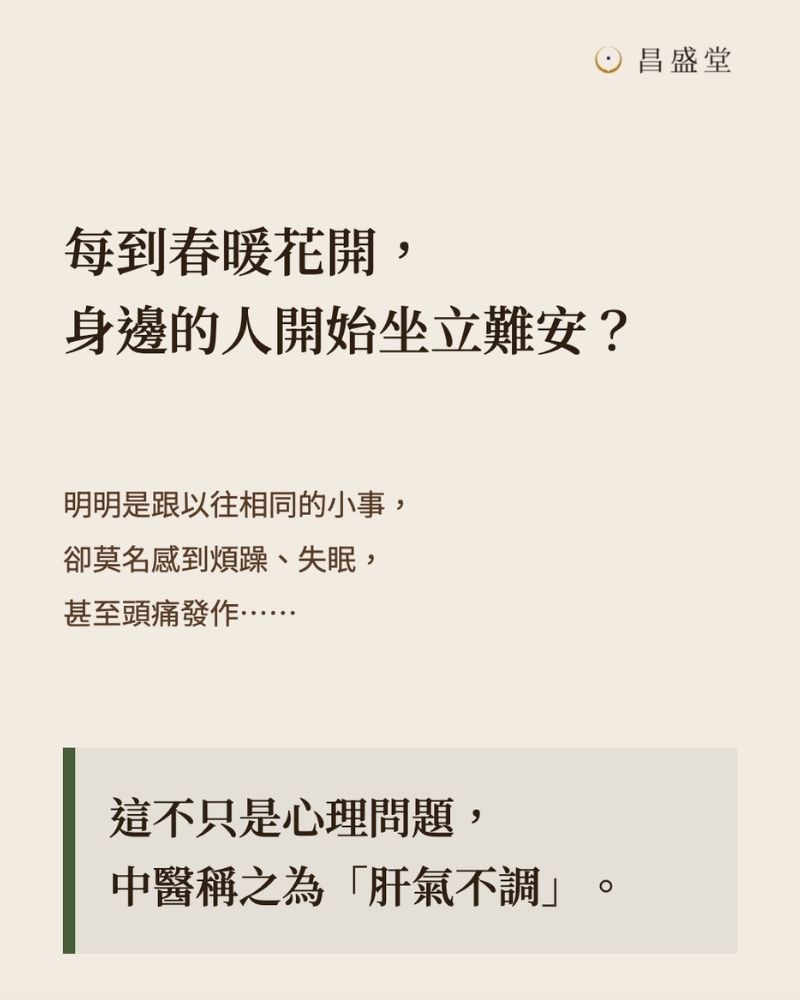 每到春暖花開的季節,我們可能會注意到自己或是身邊的人,開始出現明顯的情緒起伏,明明是跟以往相同的小事,卻會莫名地感到煩躁、坐立難安,甚至引發失眠或頭痛之類的症狀。這在心理學上,我們稱之為「季節性情緒失調」,而在中醫眼裡則可能是身體的「氣」正在順應季節發生劇烈的變化。