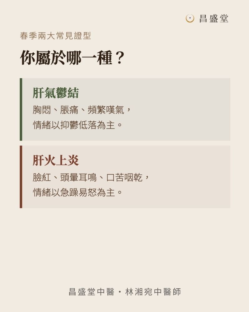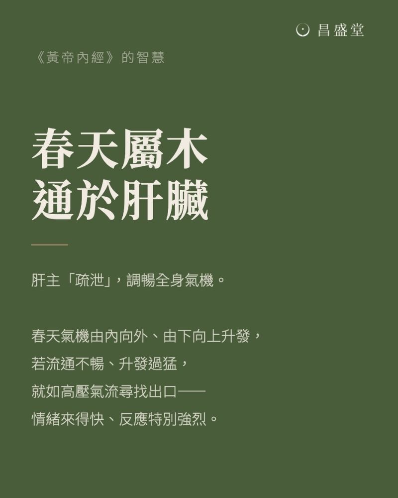 《黃帝內經》曾提到「春季」在五行屬木,通於肝臟。 肝的主要生理功能為「主疏泄」,意思是調暢全身氣機流通,尤其於春天,人的氣機會隨著環境「由內向外、由下向上升發」。且情緒之所以會呈現「來得快、反應明顯」的特徵源自於「木喜條達」的特性,若氣流通不暢、升發之力過猛,則會如同高壓下的氣流尋找出口,臨床上可能表現為急躁易怒或情緒起伏大。