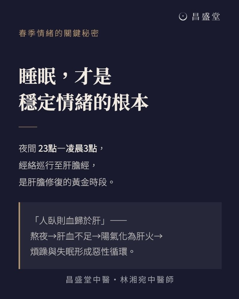 在中醫的觀點中,睡眠是穩定春季穩定情緒的重要關鍵,因為夜間23點到3點經絡巡行至肝膽經,是肝膽修復的重要期間,而「人臥則血歸於肝」,好好睡覺才能將肝血養足,若因為熬夜而肝血不足,陽氣會轉化為肝火,就會讓煩躁與失眠進入一個惡性循環。