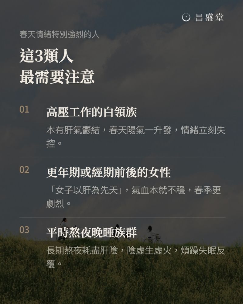 1. 高壓工作的白領族:平時工作壓力大、緊繃精神,通常本身就已經有「肝氣鬱結」的傾向,而春天陽氣開始升發時,就容易出現前面所提到的情緒失控、煩躁、頭痛、失眠等症狀。