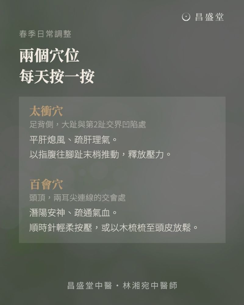 針對春季影響情緒的「氣鬱」與「火旺」,可以選取以下的穴位進行按摩: