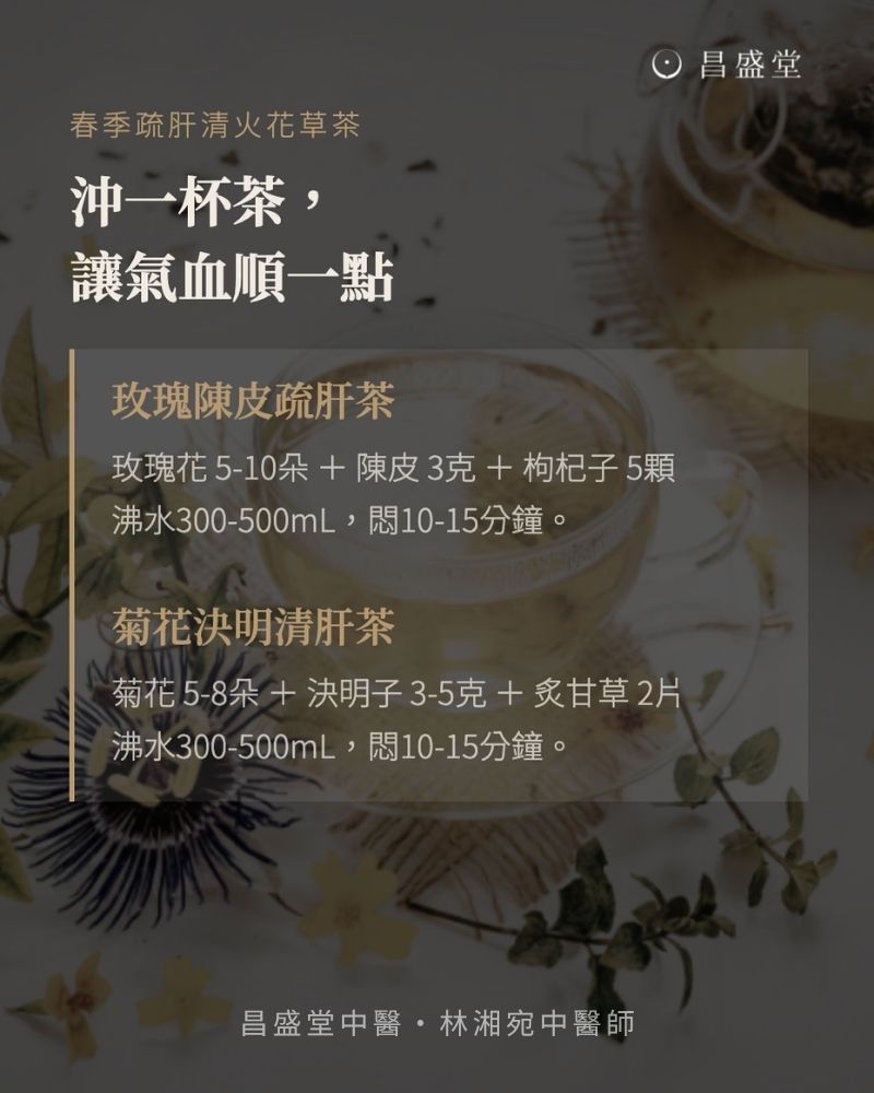 另外,在春季也適合沖泡一些花草茶,幫助身體放鬆、氣血順暢,以下材料以300-500mL的沸水沖泡,悶10-15分鐘即可飲用,以達到疏肝清火的作用,幫助放鬆心情、排解壓力: