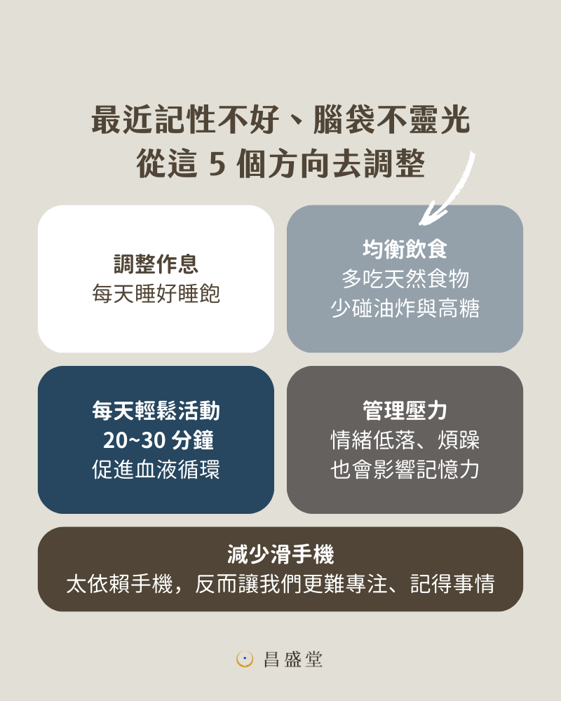 - 管理壓力:情緒低落、煩躁也會影響記憶力