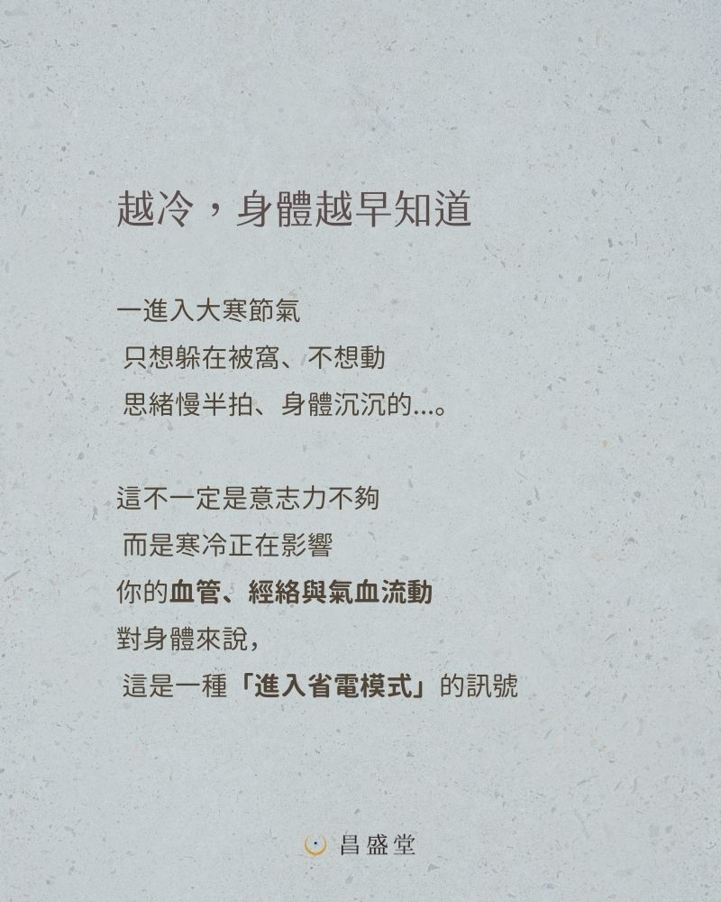 這個時候人體的能量(腎氣)會回到臟腑深處,人自然不想動。這是身體在「蓄積能量」,為來年的春天做準備。另外冬日的寒氣會讓氣血凝滯、經絡收縮,使得身體的氣血運行也變慢了,也就可以觀察到肢體僵硬、思緒遲鈍的現象。