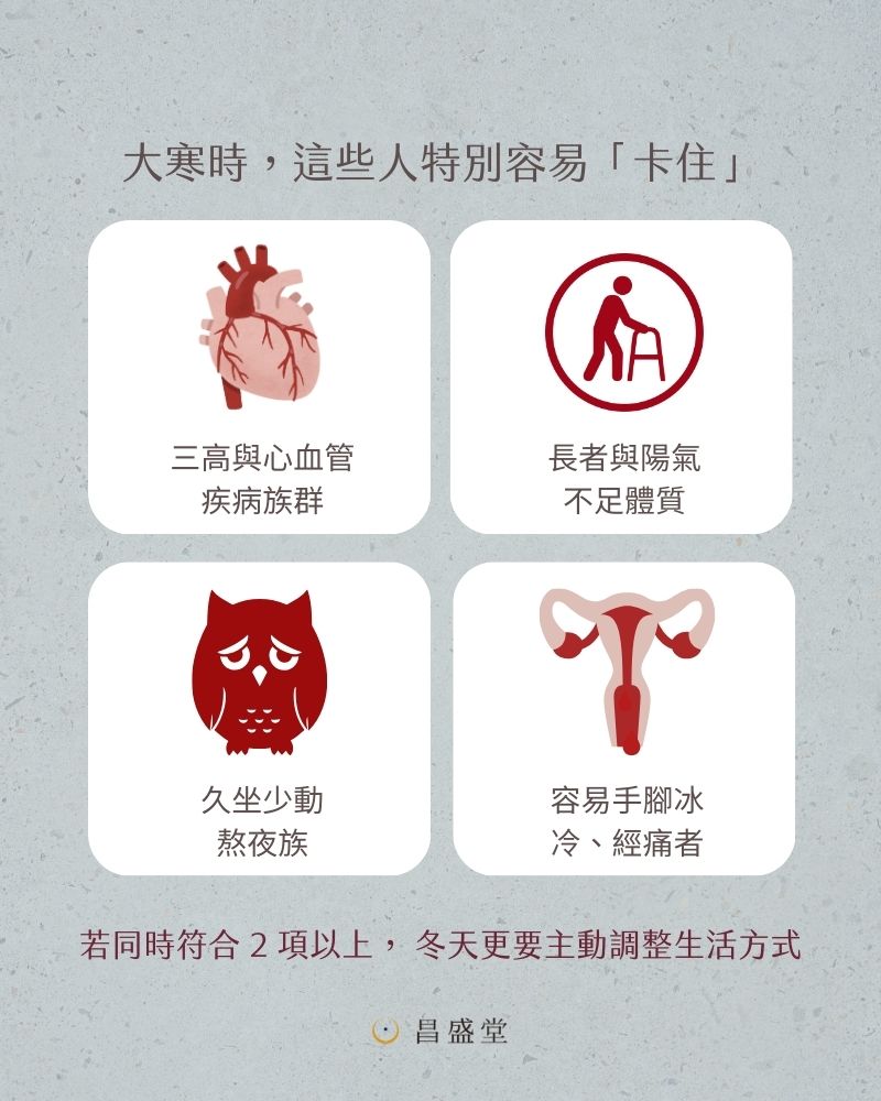 心血管系統:天冷時「心陽」受到寒氣壓制,導致推動血液無力,容易引發「胸痺」(心悶痛)。