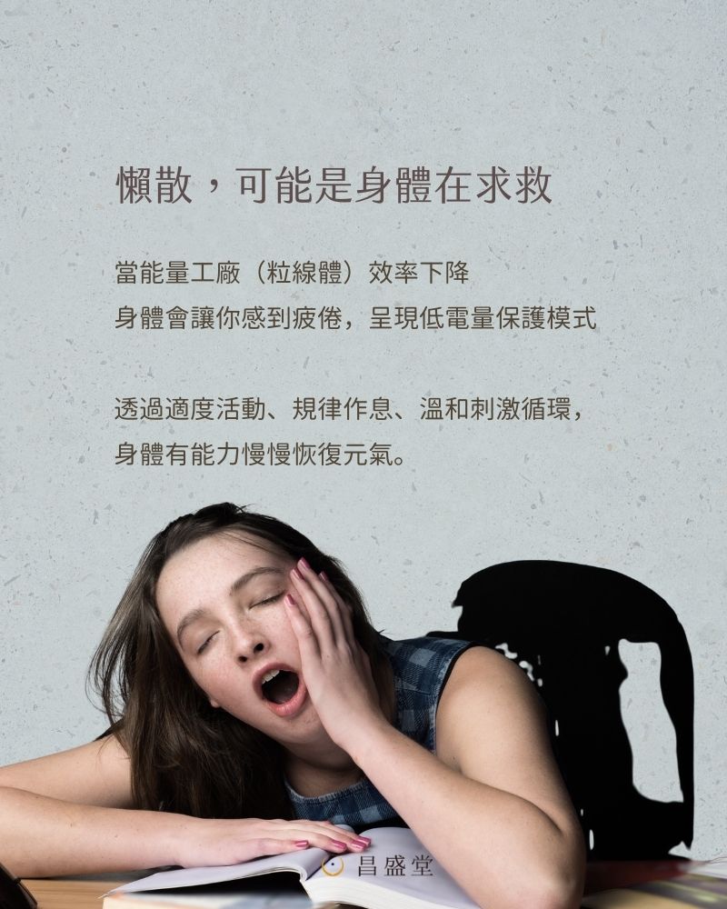 用現代科學來看,其實就是你細胞裡的發電廠-粒線體運作效率變差了。正常功能的粒線體在細胞中,負責產生能量(ATP)。但當他老化或是受損後,不但發電量少,還會排放大量自由基,導致細胞發炎。當體內充滿大量「老、廢粒線體」,身體會為了節能並減少自由基傷害,會強制讓我們感到疲倦,逼身體休息。這不是心態上的懶,是生理上的低電量保護模式。